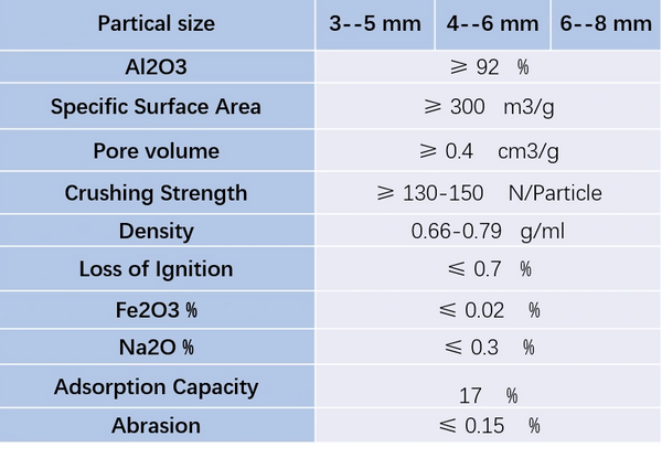 Activated Alumina has a pure white round spherical appearance with a large surface area, uniform particle size, smooth surface, high mechanical strength, good thermal stability, and strong hygroscopicity. It absorbs water without swelling, cracking, or deformation, and is easy to regenerate. Applicable to: adsorbents and desiccants in the chemical, petrochemical and natural gas industries. It can also be used as fluoride remover, water purifier, air compressor, catalyst and catalyst carrier.